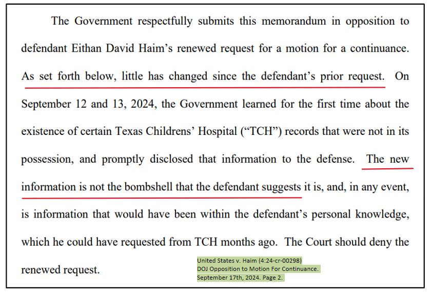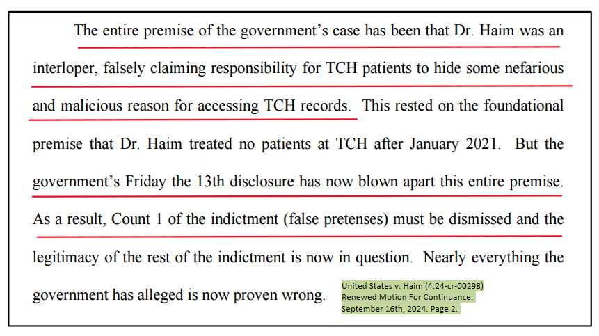 "The digital audit trail leading us to these patients was in their own discovery they gave to me back in June. The FBI agent on this case told me in a face-to-face meeting in July that an "asteroid would have to strike Galveston Bay" for Dr. Haim to be called into cover a surgery at TCH. That's how certain he was of his own case. I guess the agent failed to look at the audit trails in the discovery folder titled "FBI" on the USB drive."