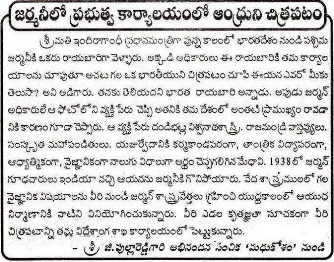 Germans had no way of storing bombs without exploding. Dandibhatla Vishwanathashastri suggested a solution to that problem from the Yajurveda.He has been revered ever since. He shared his scientific erudition with the Germans. He helped Germany to become one of the most developed countries in the world. Dandibhatla Viswanatha Sastri’s lone written work left was Bhuttoji Dixit’s grammar work Siddhanta Kaumudi. Nageshabhattu’s short commentary on this is available at the Oriental Library, Hyderabad.