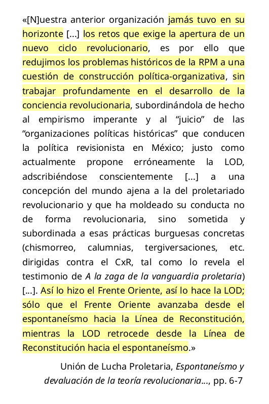 Como decía ULP al analizar su trayectoria, el revisionismo en general (y la LOD en particular) personifica esta reducción de «los problemas históricos de la RPM a una cuestión de construcción política-organizativa»: [8/13]