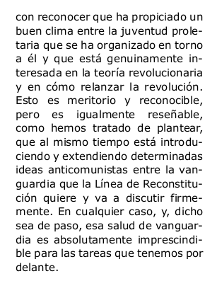 Es decir, que, para la LOD, la ideología revolucionaria y su recuperación es irrelevante para la creación de un «buen clima» en la vanguardia. La LOD celebra abiertamente un ambiente de vanguardia en el que impera el revisionismo y el anticomunismo, pues [10/13]