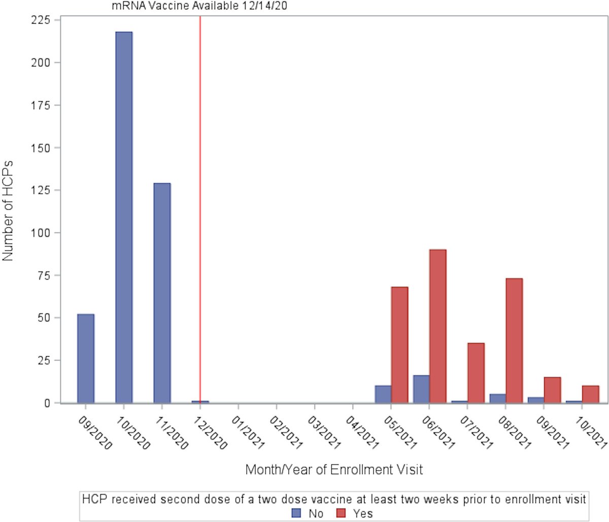 2) This study examined SARS-CoV-2 anti-nucleocapsid (anti-N) antibody seropositivity among healthcare personnel (HCP) without a history of COVID-19, both before and after the rollout of SARS-CoV-2 vaccines.