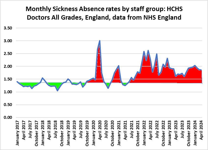 Below is another important chart which shows sickness absence rates for NHS doctors across all grades from Jan 2017 - Apr 2024.