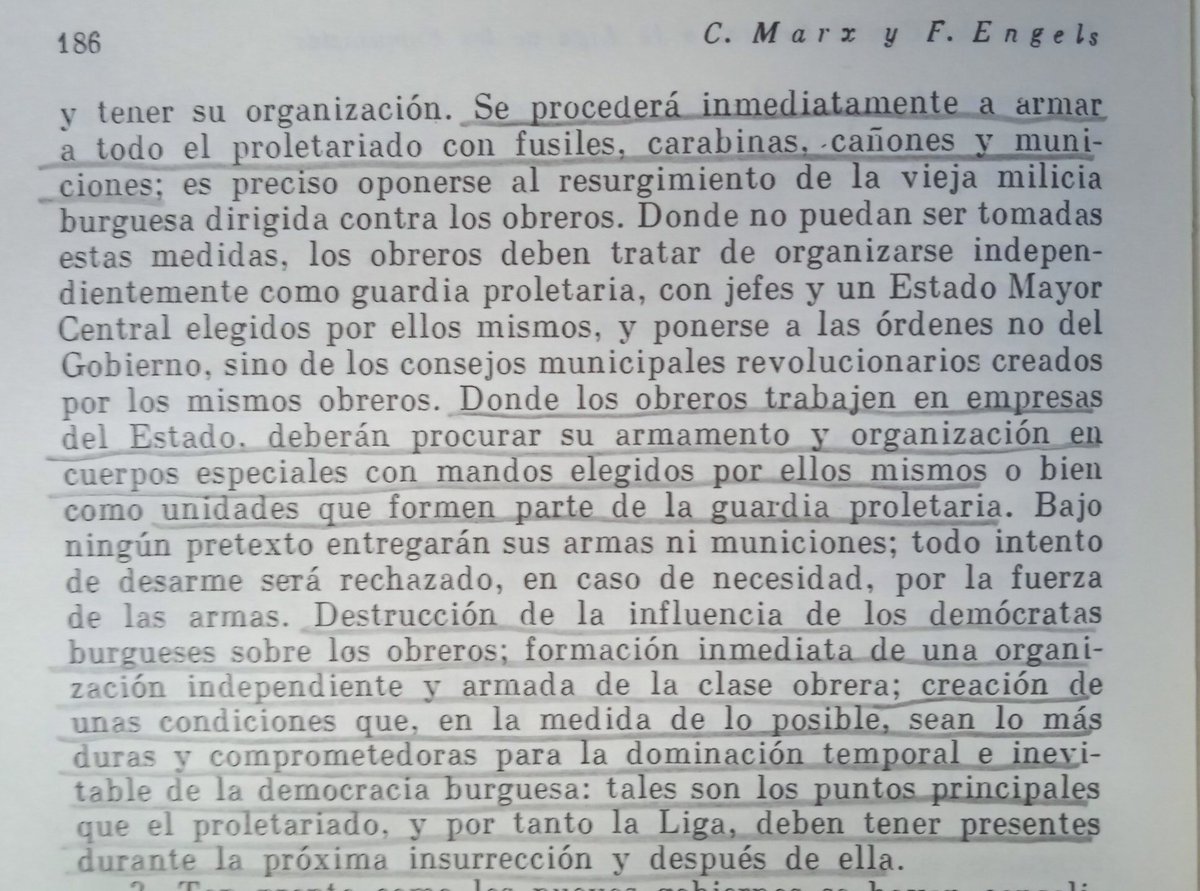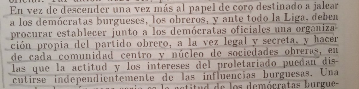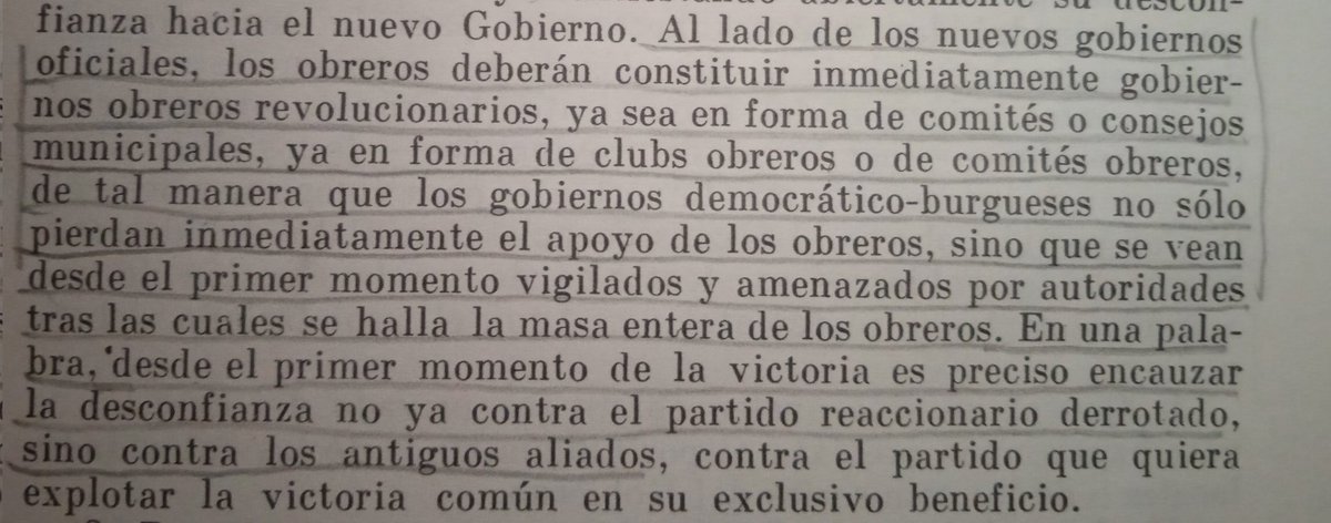 Esta independencia política del proletariado no debe plasmarse sólo en una organización propia, sino dentro de la propia revolución. El proletariado debe organizar siempre sus propias instituciones, su propio ejército, su propio poder frente al poder burgués.