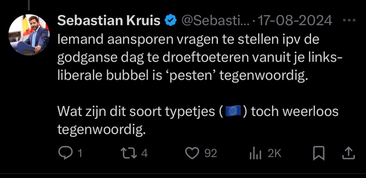 Sommige PVV’ers beklagen zich over de bergen haat die ze over zich heenkrijgen. Zoals hier Sebastiaan Kruis. Het schijnt ongekend te zijn. Daarom een bloemlezing uit de timeline van dit EP-lid dat namens de PVV €10.377,43 krijgt per maand (ex toeslagen ed). Zie hier een 🧵1/x