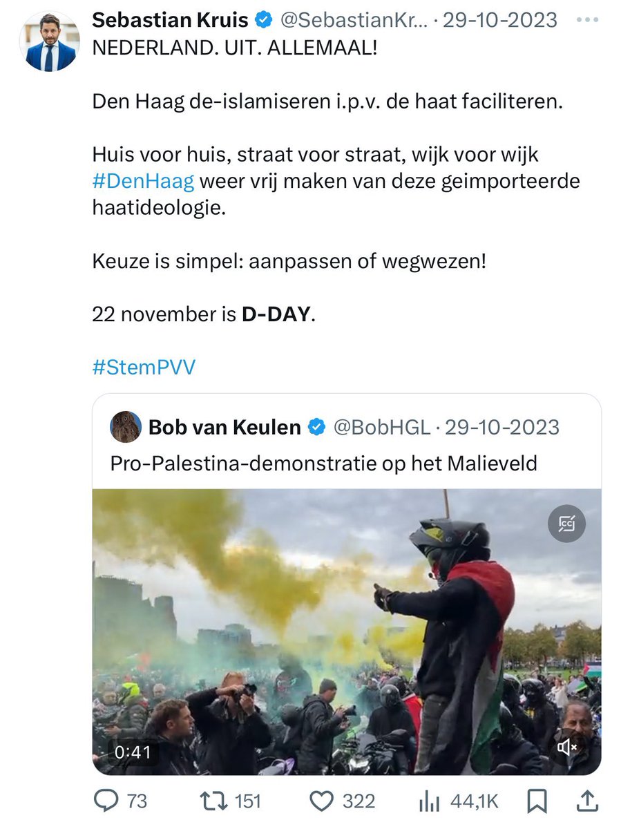 Zo kennen we deze post. Waarin dezelfde Kruis (die zich dus beklaagt dat PVV’er haat krijgen) die Kruis roept op tot een razzia, “huis voor huis, straat voor straat”. 2/x 👇🏻