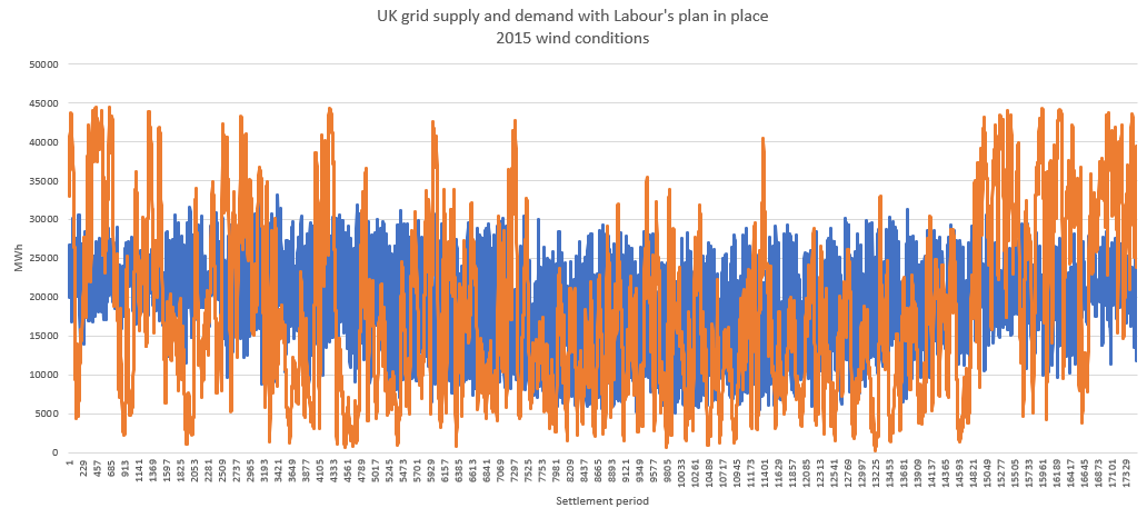 I've crudely estimated the Labour Party fleet as 90GW of wind, 42GW solar, plus 6GW nuclear, and assumed a modest rise in demand to 330TWh.