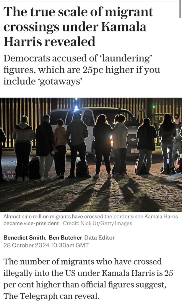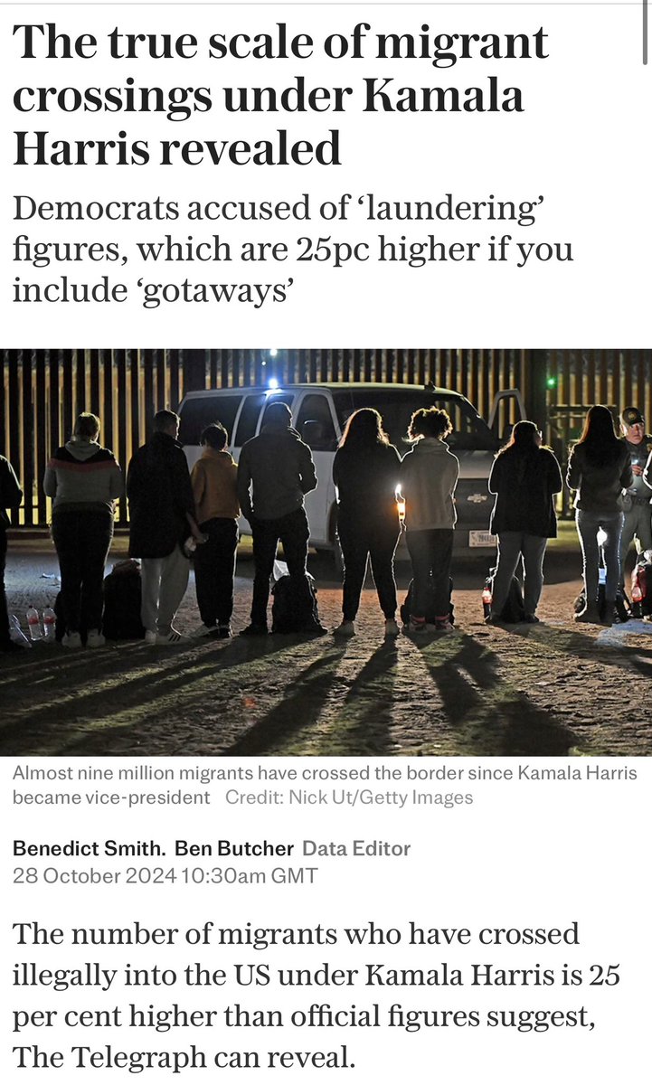 “The number of migrants who have crossed illegally into the US under Kamala Harris is 25 per cent higher than official figures suggest, The Telegraph can reveal… A freedom of Information request submitted by The Telegraph shows that the agency calculates an extra 1.8 million migrants crossed the US’s southern, northern and coastal borders without being apprehended between February 2021 and September 2024.”