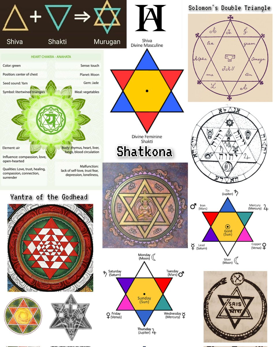 The Shatkona is the Unity of Shiva and Shakti, Masculine and Feminine, Yin and Yang, to form their offspring, the Divine Angrogyne, Lord Murugan or, what Alchemists called the Alchemical Hermaphrodite (REBIS).