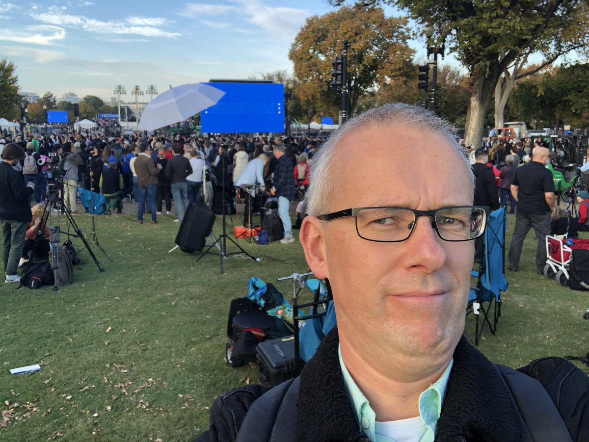 U ziet het niet maar achter het scherm is dus straks de manifestatie en daarachter ligt het Witte Huis. Hier op dit grasveldje televisieploegen die allemaal kennelijk niet binnen mochten.