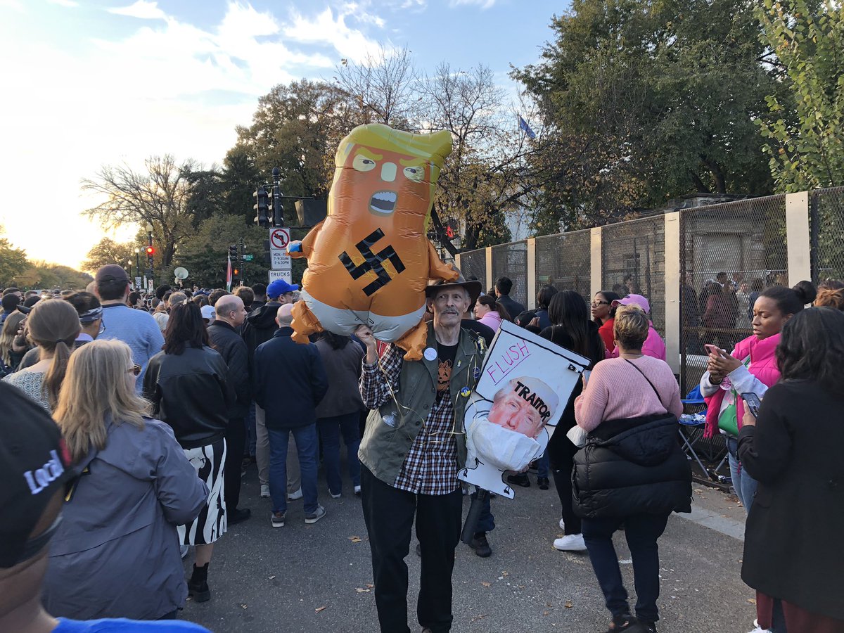 Een man heeft een ballon van Trump bij zich waarbij op Trump een hakenkruis is gezet. Een paar meter verder een man met een luidspreker die wil dat de VS stopt met de steun aan Israël.
