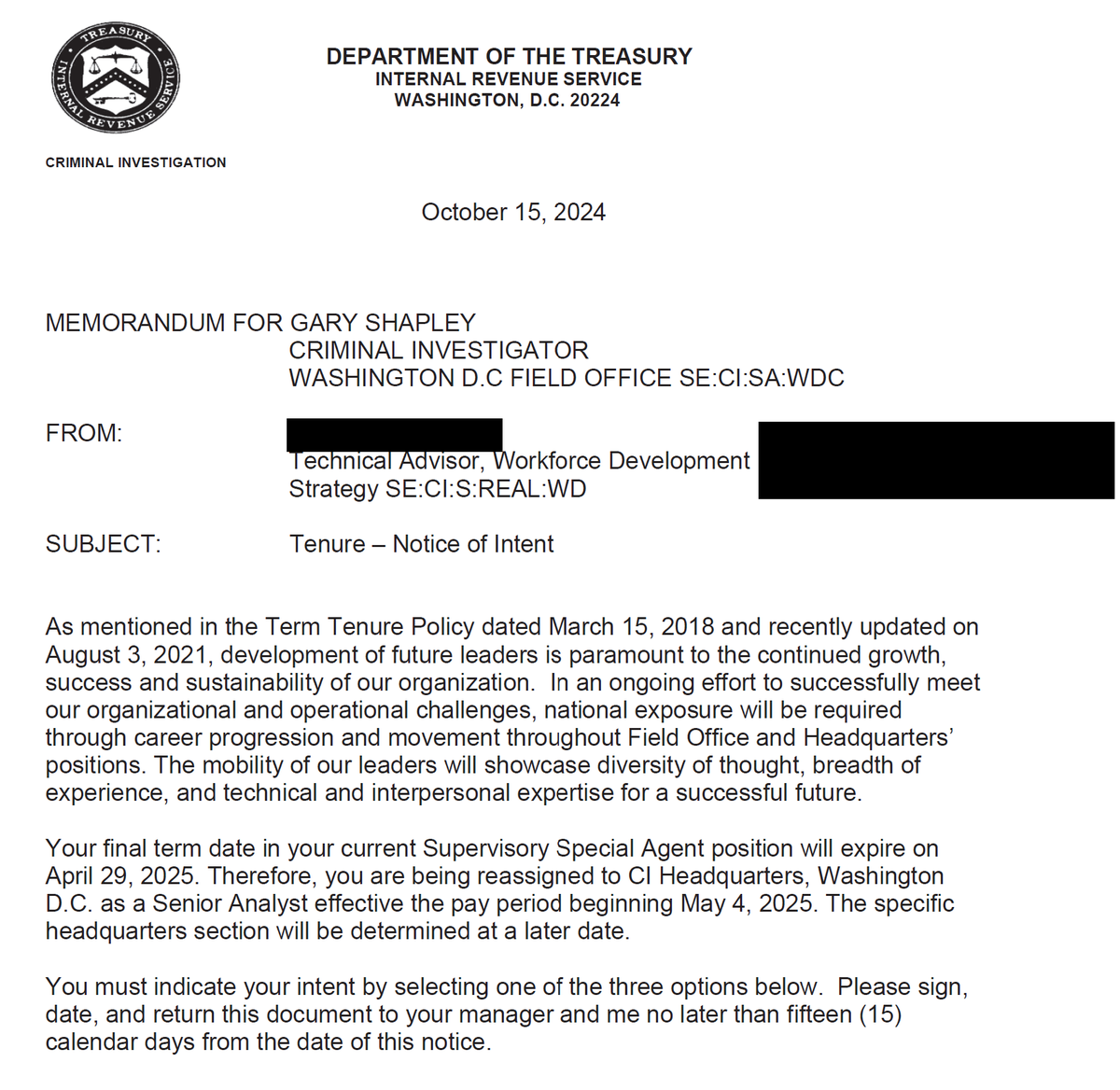 Less than an hour after @C__Herridge posted this story yesterday about the retaliation against the IRS whistleblowers, the IRS sent SSA Shapley this notice telling him he had 15 days to choose whether to be demoted or to resign. (Apparently they were sitting on it for two weeks before the story.)