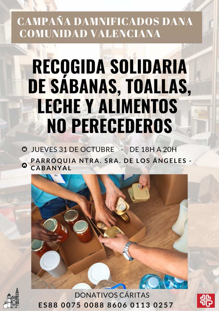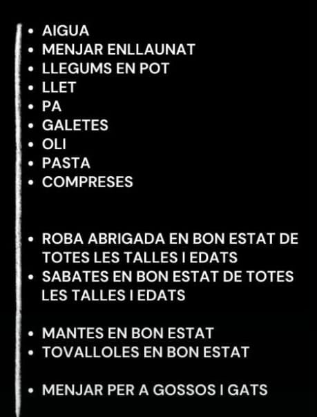 Associació veïnal de Benimaclet l'horari d'11 a 13 h i de 16 a 20 h, l'av. Valladolid 42, aporteu els productes llistats en el cartell adjunt.