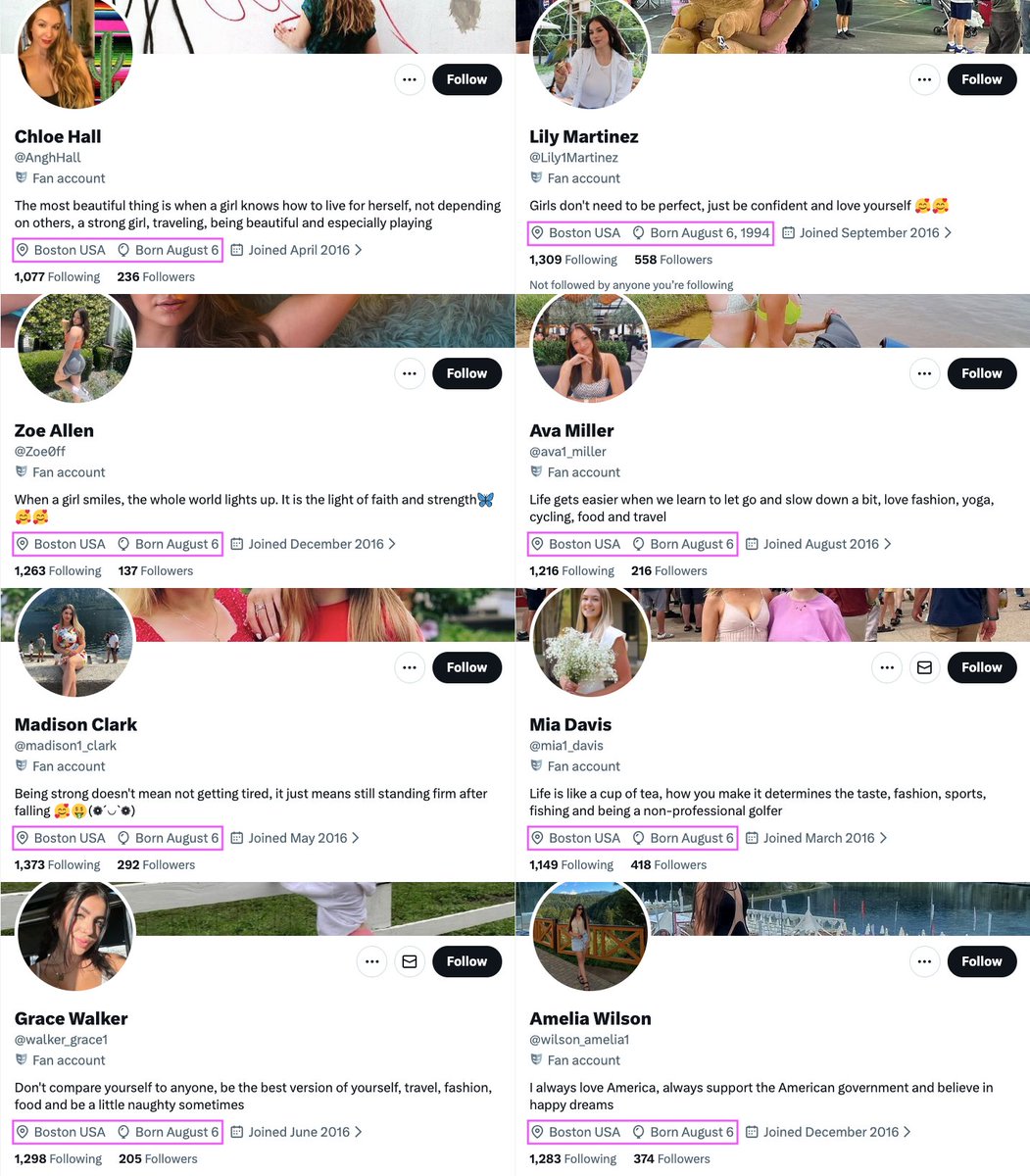 The powered-by-AI nature of this network was revealed by variety of glitches in LLM-generated tweet texts and GAN images.
