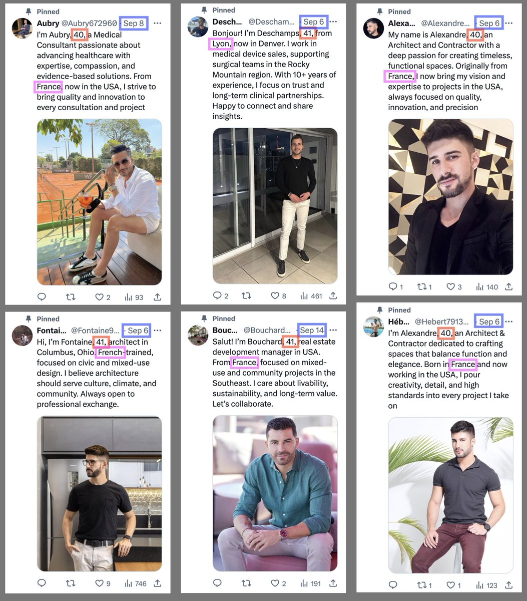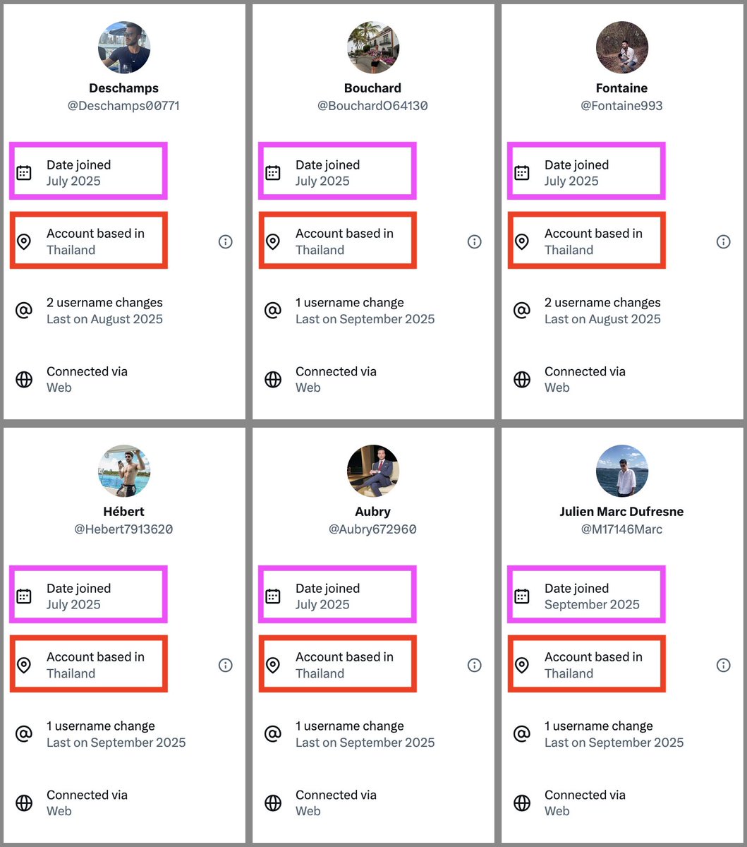 All created on Jan/Feb-2024, these accounts stayed inactive or politically indifferent until 15 Sep 2025.