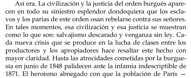 El Estado, supuesto representante de la "sociedad", se revela como lo que es: expresión política de la dominación de la burguesía, organismo cuya función "público-reguladora" se encuadra dentro de los límites que le marcan los intereses de la clase capitalista.
