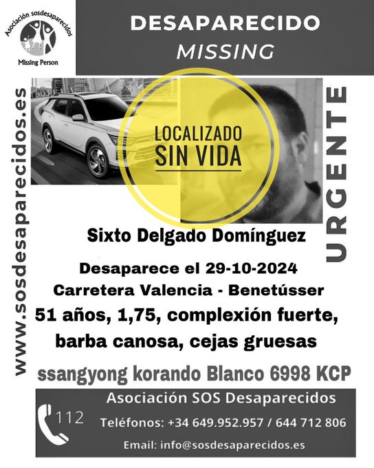 Desaparecido el 29 de octubre en un ssangong Korando blanco 6998KCP en la calle Valencia de Benetússer