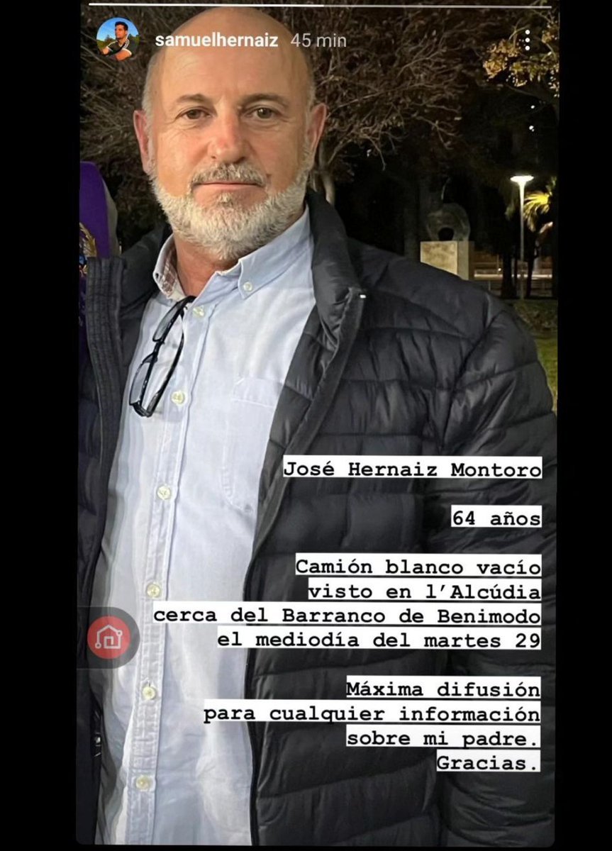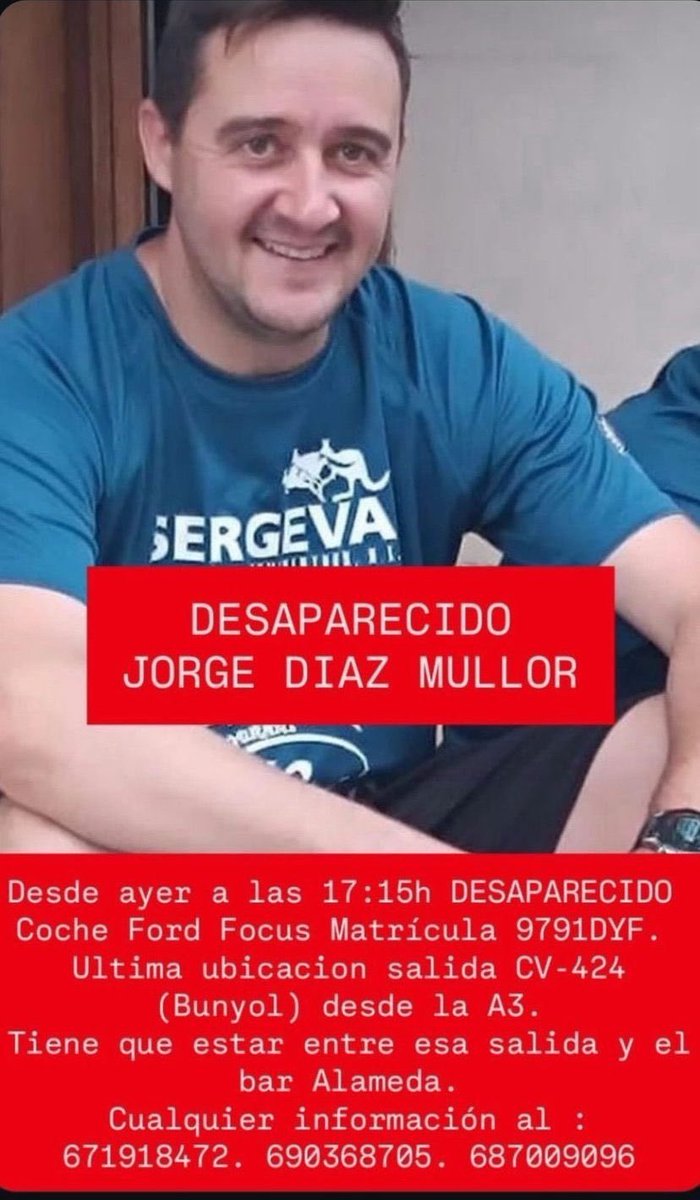 Desaparecido el 29 de octubre, fue visto por ultima vez en la CV383 cerca del circuito de Cheste conduciendo su Volvo XC60 6441MDD