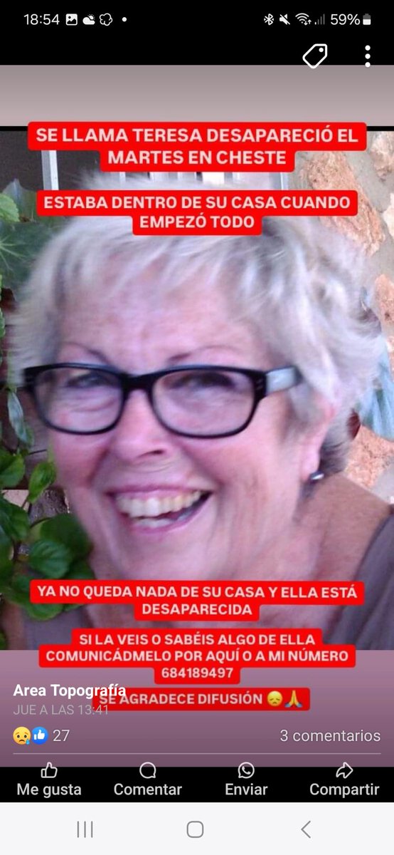 Desaparecida el 29 de octubre mientras circulaba por la A3 en un Kia blanco. Llamo pidiendo auxilio por que el agua se llevaba su coche.