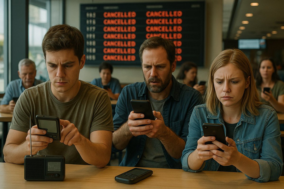 Las aerolíneas cancelan todos los vuelos que van a salir y mandan a los que están en el aire que vuelvan a los aeropuertos mas cercanos. Los móviles se sobrecalientan en la mano justo antes de apagarse para siempre. Las radios emiten ruido blanco. Mientras los servidores de internet se reinician en bucle una y otra vez sin llegar a conectar.