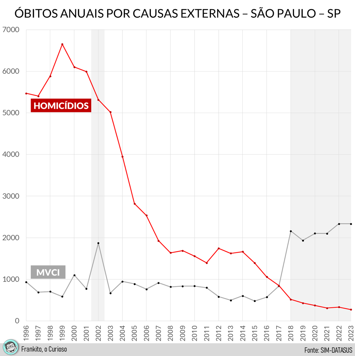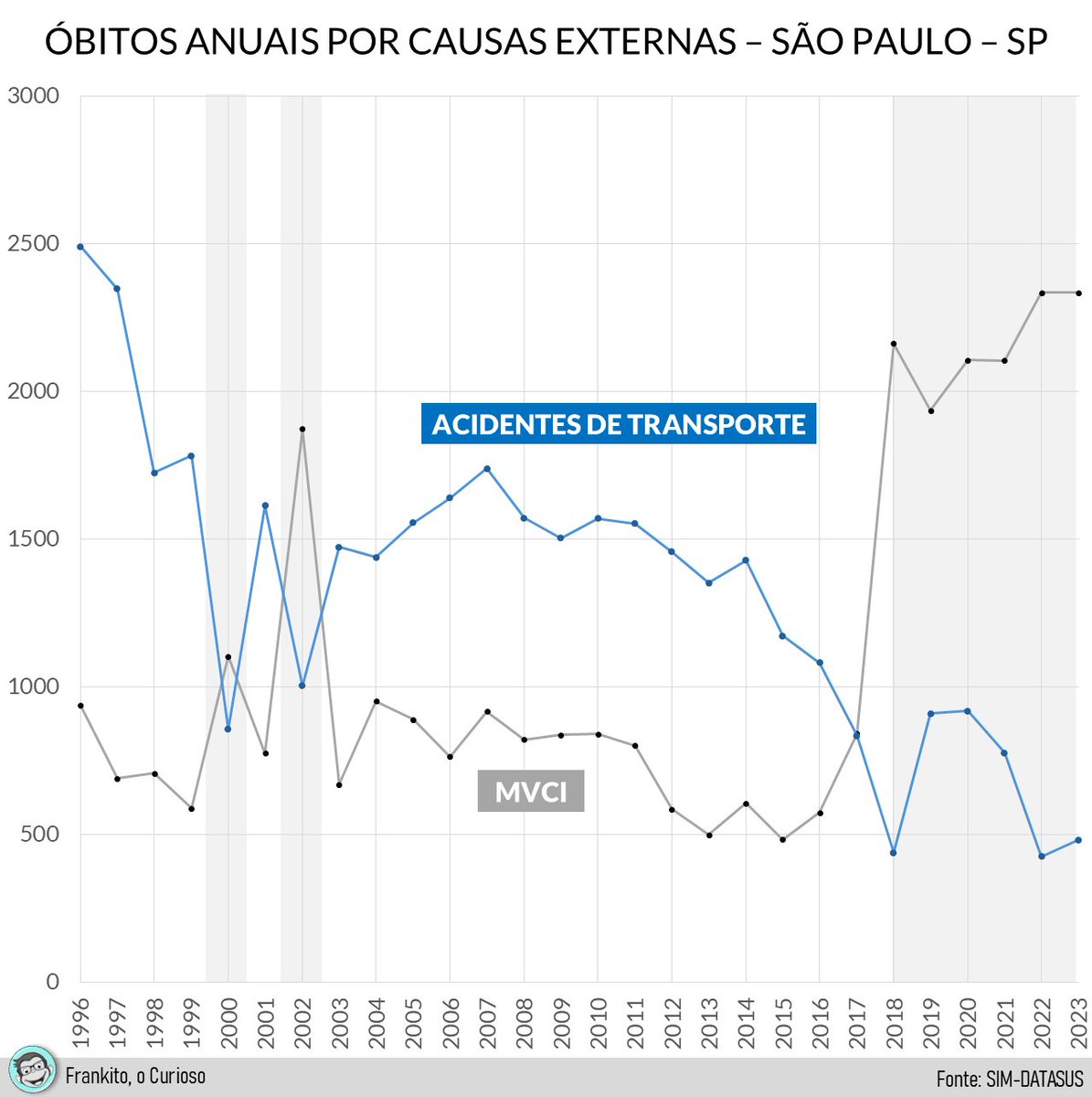 5. Voltando ao meu fio de ontem, vejam que as MVCIs têm alguma correlação (negativa) com óbitos no trânsito. Notem que a alta de MVCIs vem desde 2018 - são 6 anos já neste nível.