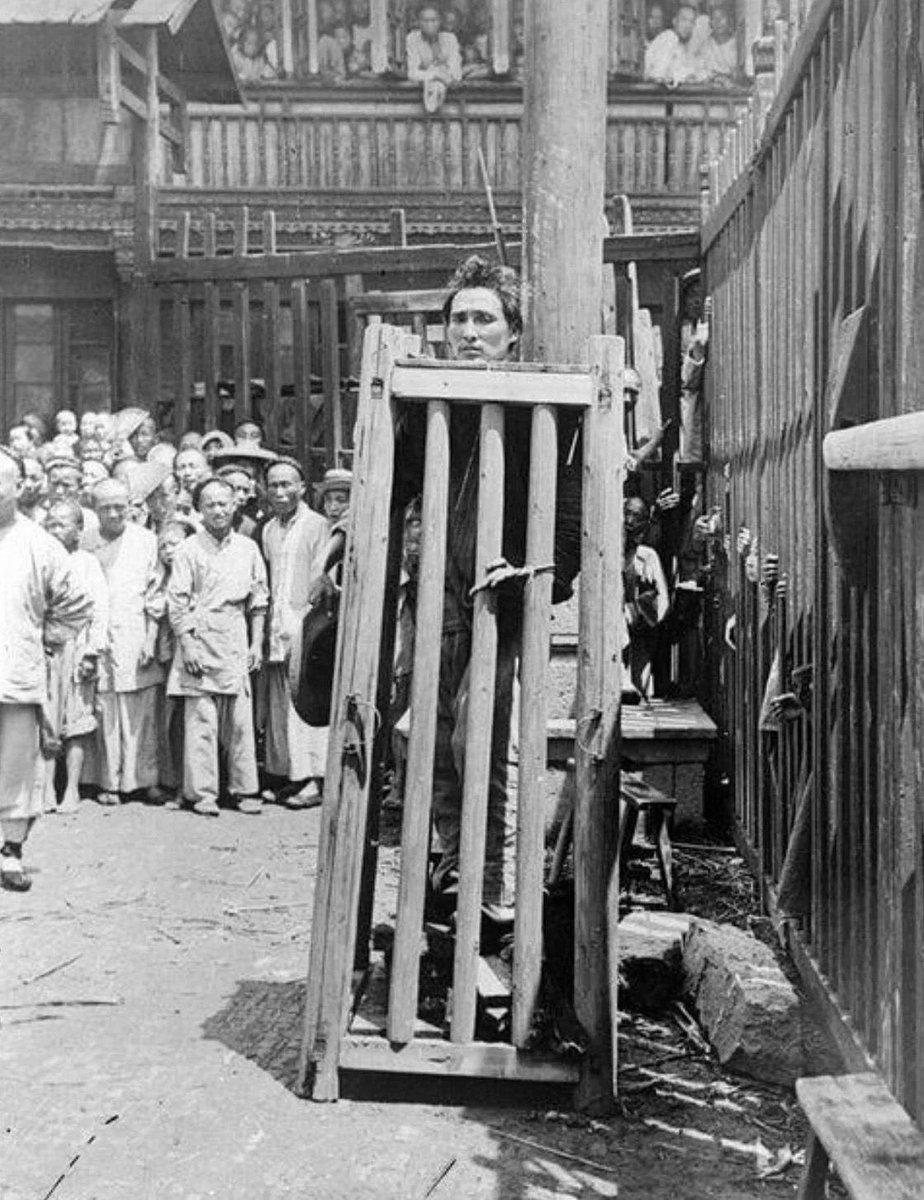 13. A man convicted of murder imprisoned in a wooden cage on a street in China. He was left to die of thirst, starvation, and exposure, circa 1930.