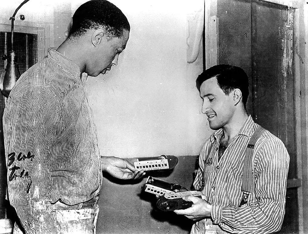 18. Joe Arridy was a mentally challenged man who was wrongfully accused and arrested for murder and rape. This is a photo of him giving his toy trains to a fellow inmate preceding his execution, 1939.