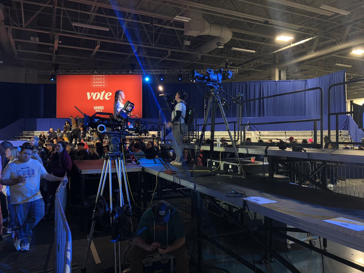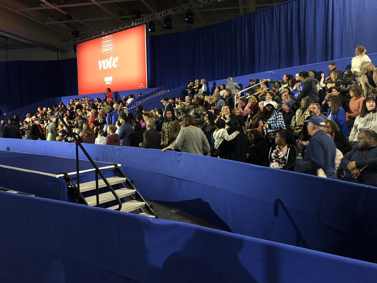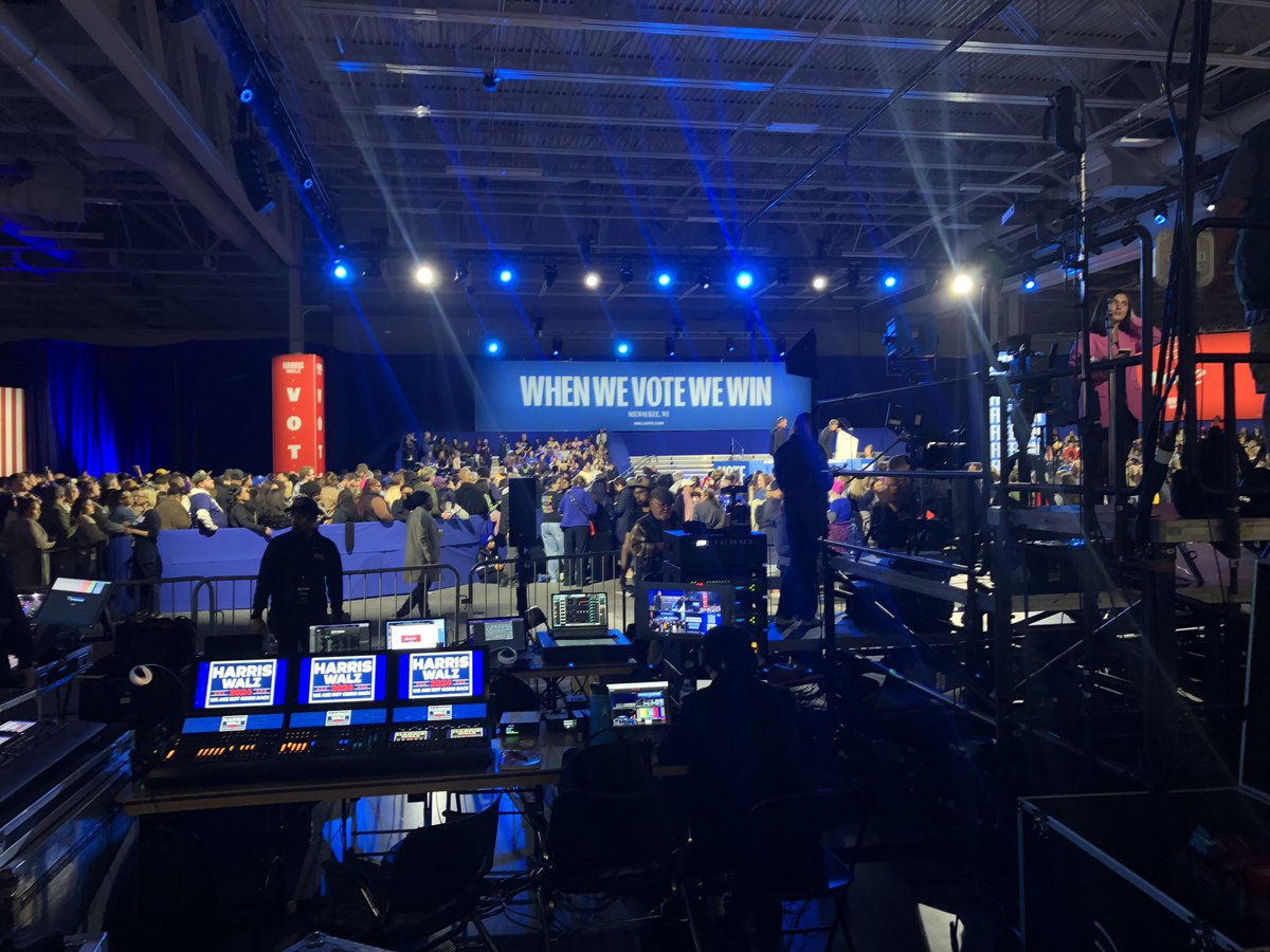 Inmiddels is de muziek weer verder als bandje. We zijn in afwachting van Kamala Harris.