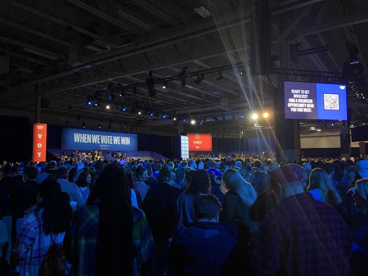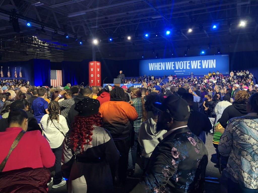 Nu de burgemeester van Milwalkie. Hard gejuich. De race hangt van ons allemaal af, zegt hij. Burgemeester is een zwarte man, publiek hier is zeer divers. We staan echt op een kruispunt, zegt hij. Maar als Milwalkie stemt, winnen we. Gejuich.