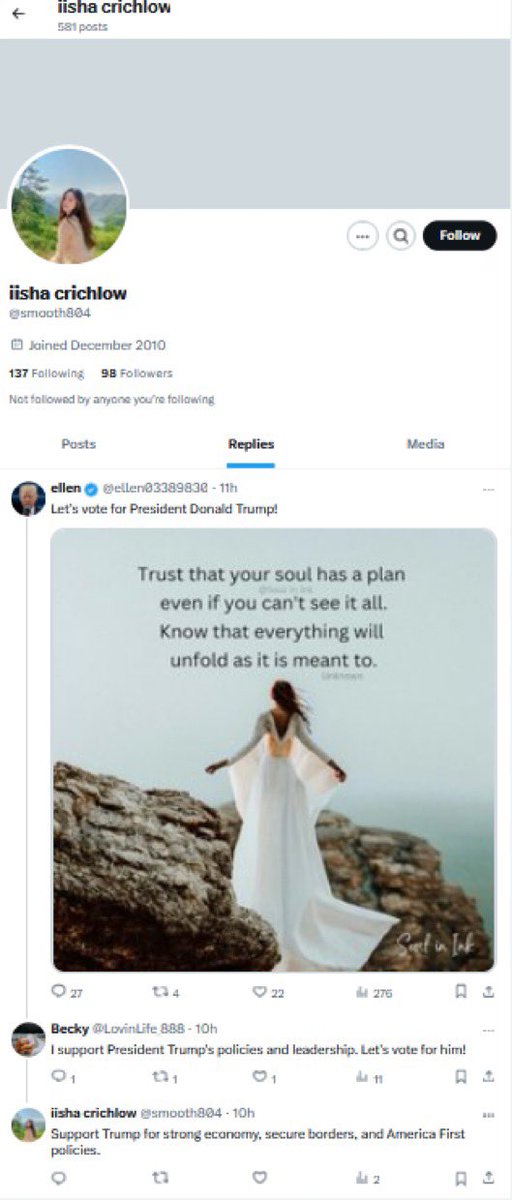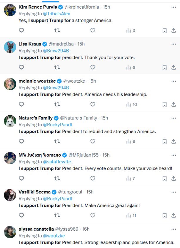 Repetitive, Robotic Messaging: Scroll through these accounts, and you’ll see the same cookie-cutter phrases – “I support Trump for president” paired with hashtags like #MAGA, #2A, #KAG.