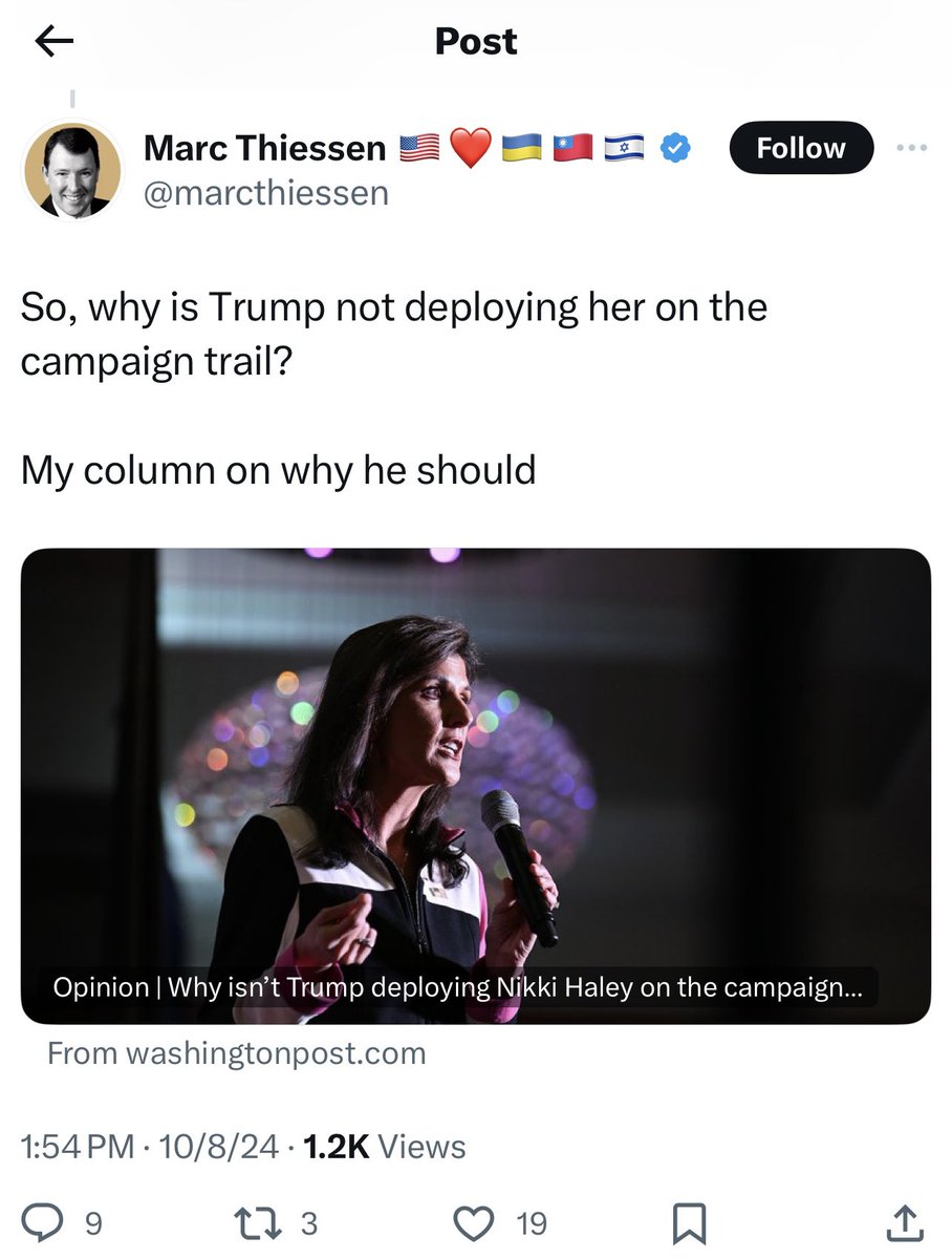 But you can’t remove the context. Thiessen’s surprise that Trump isn’t asking Haley for help comes from the same place as his dismissive statements about people worrying more about the man Trump is than about his policies: an obstinate choice to avoid understanding.