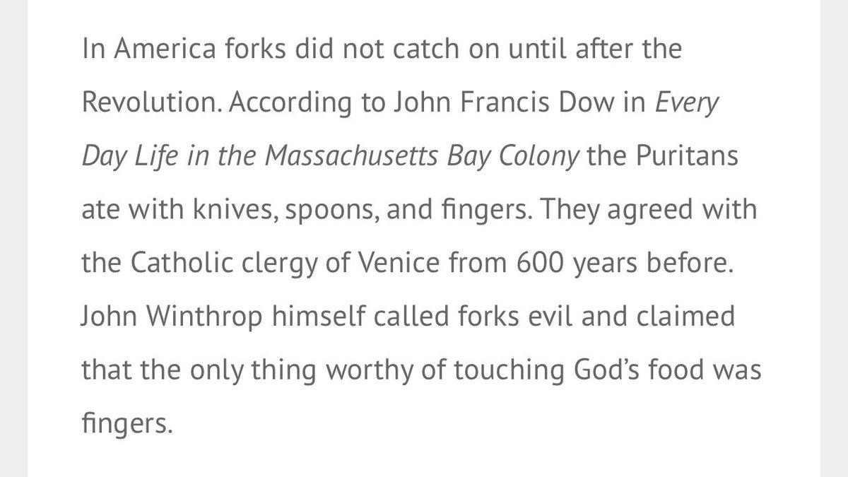 Puritans, too, took up the fight against forks alongside their battles against witches, declaring the fingers as the only thing worthy of touching God’s food.