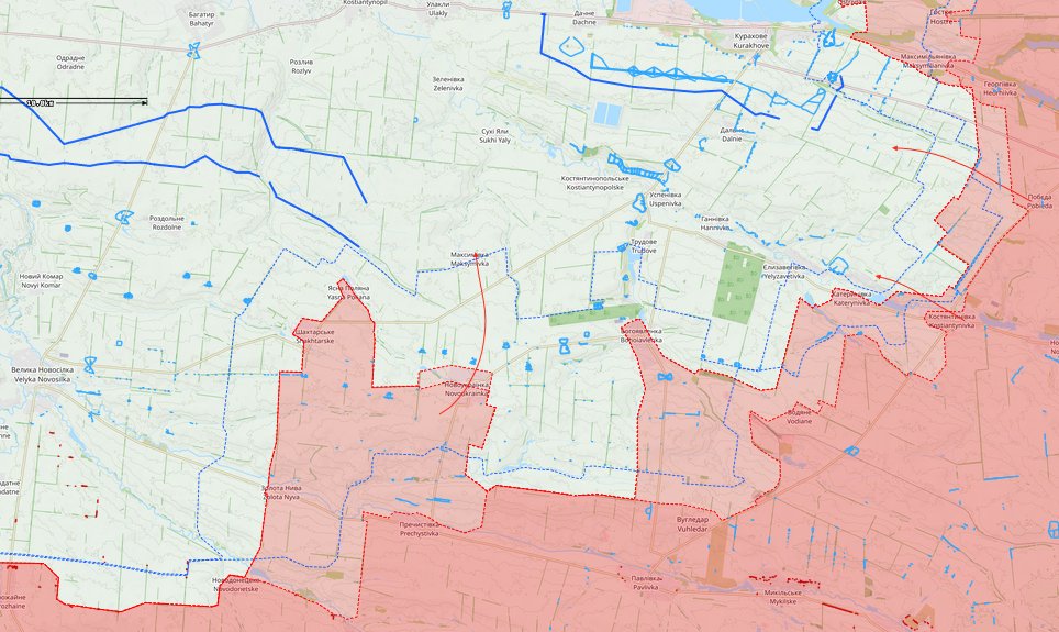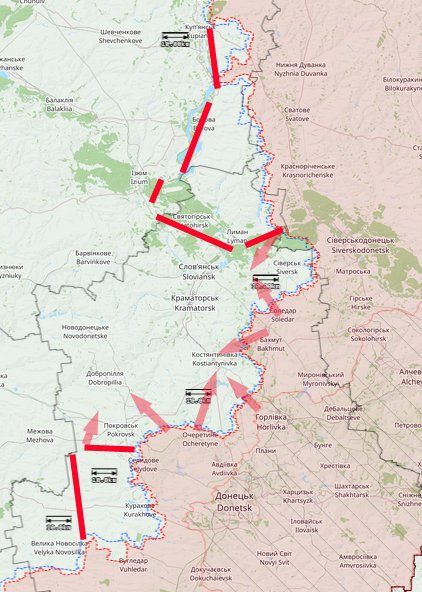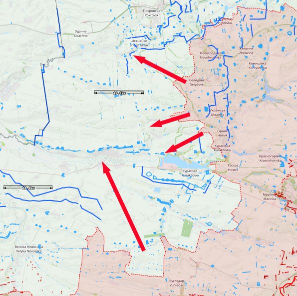 Für die nächsten Wochen ist eine Fortsetzung der ungewöhnlich massiven RU Angriffe zu erwarten. Ziel dürfte - wie bereits vor 3 Monaten vermutet - die Eroberung des gesamten Südteils von Donetzk sein, wobei Pokrowsk zunächst S umgangen wird. Hier dürfte das N-Ufer des Stausees bei Kurachowe Zwischenziel sein