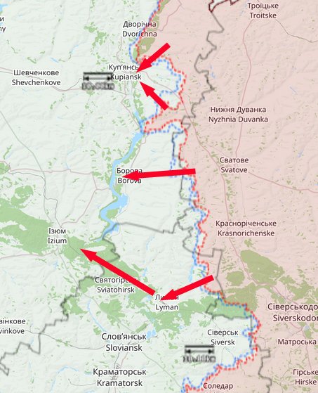 Trotz zeitweilig intensiver RU Angriffe nur geringe Geländegewinne. Einziger echter Erfolg ist das Erreichen des Oskil S Kupjansk, womit das UA gehaltene Gebiet O des Flusses gespaltet wurde