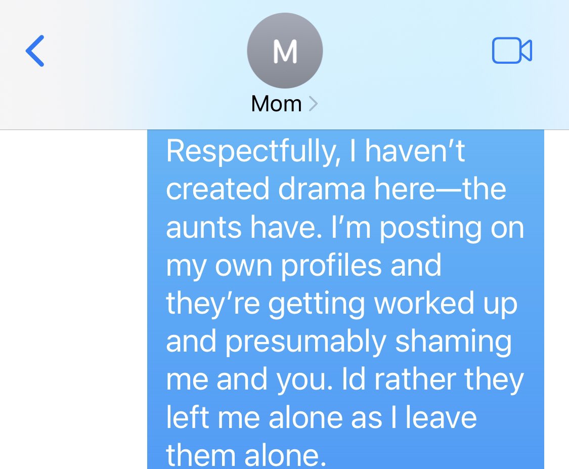 My mom is embarrassed of my Trump vote and is being shamed by her sisters, two of whom sent nasty texts to me. She is also concerned about my memoir describing my childhood abuse from my father.