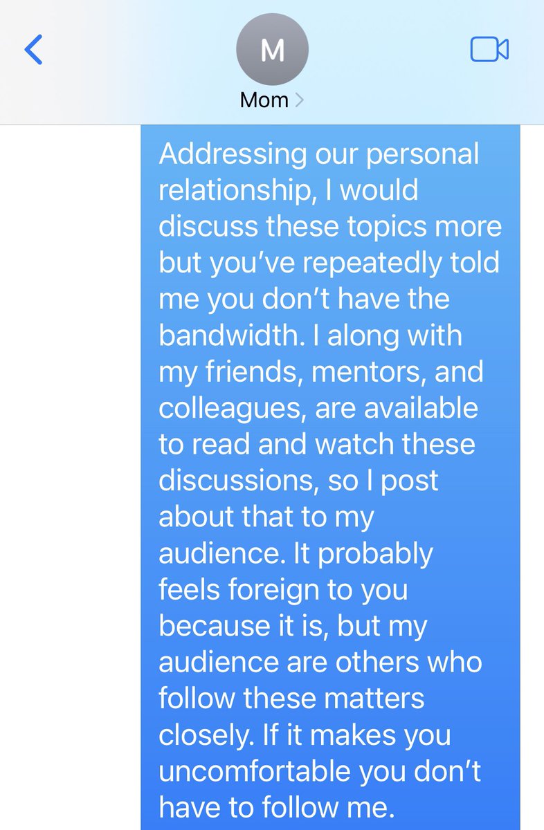 I am posting this frustrating exchange with my mom to model setting and accepting boundaries for others in similar situations: