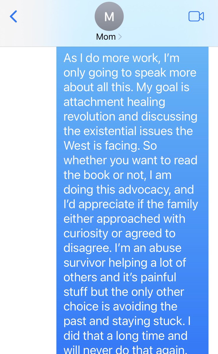 I also acknowledged previous discussions we’ve had about her mental unavailability to research these topics. It is somewhat alienating that my family isn’t interested in gender ideology or my work, but I’ve accepted previously that they don’t want or need the stress.