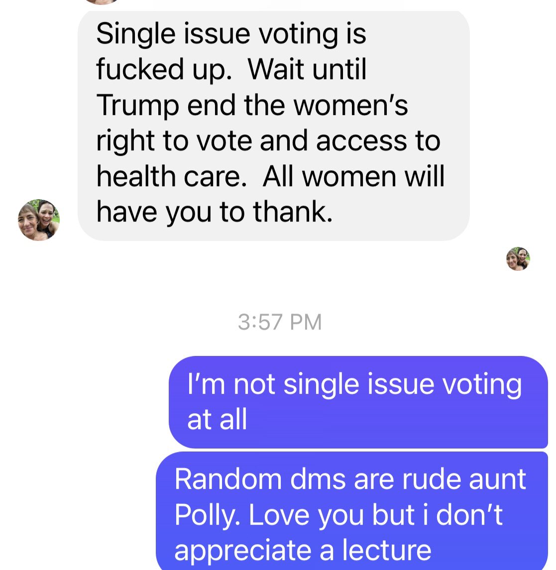 What this response shows is that my political views and association with anti-trans politics disrupts her self-perception as a tribal liberal. She fears rejection from her tribe and as a mother.
