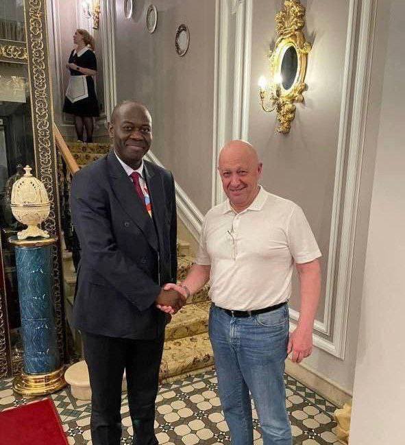 The picture of Prigozhin doing the rounds on social media shows him shaking hands with Ambassador Freddy Mapouka, the Director of State Protocol at the Presidency of Central African Republic, at a hotel in St Petersburg. How do we know this? Quick 🧵
