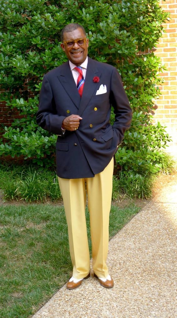 Here are two more sport coat outfits. How do we know these are sport coats? Jackets have brass buttons, making them blazers. Note how all the colors here are slightly warm (they have red or yellow undertones), making the outfits feel cheery.