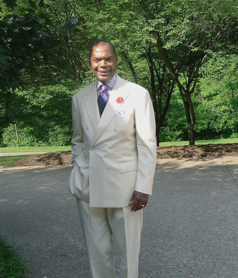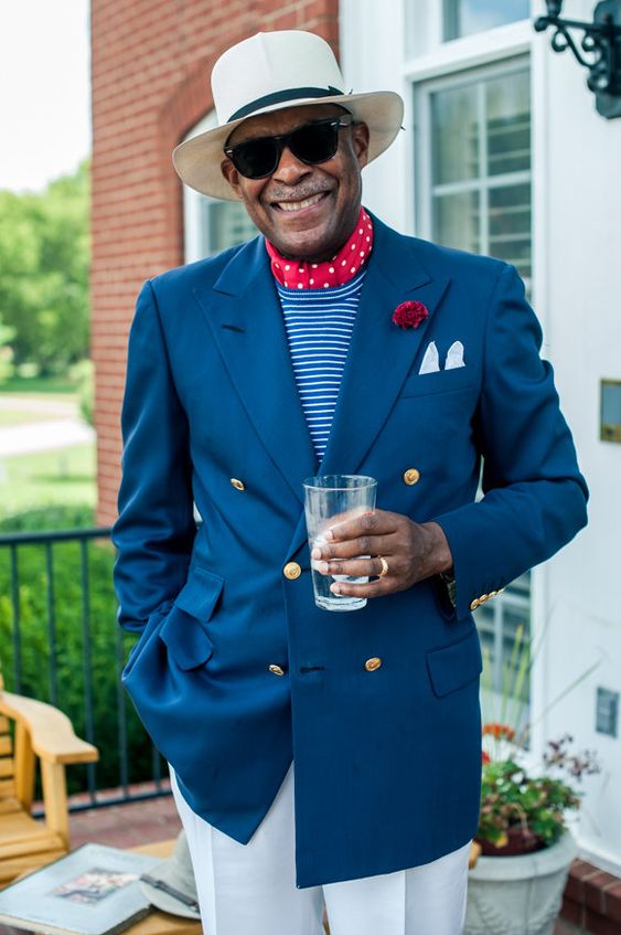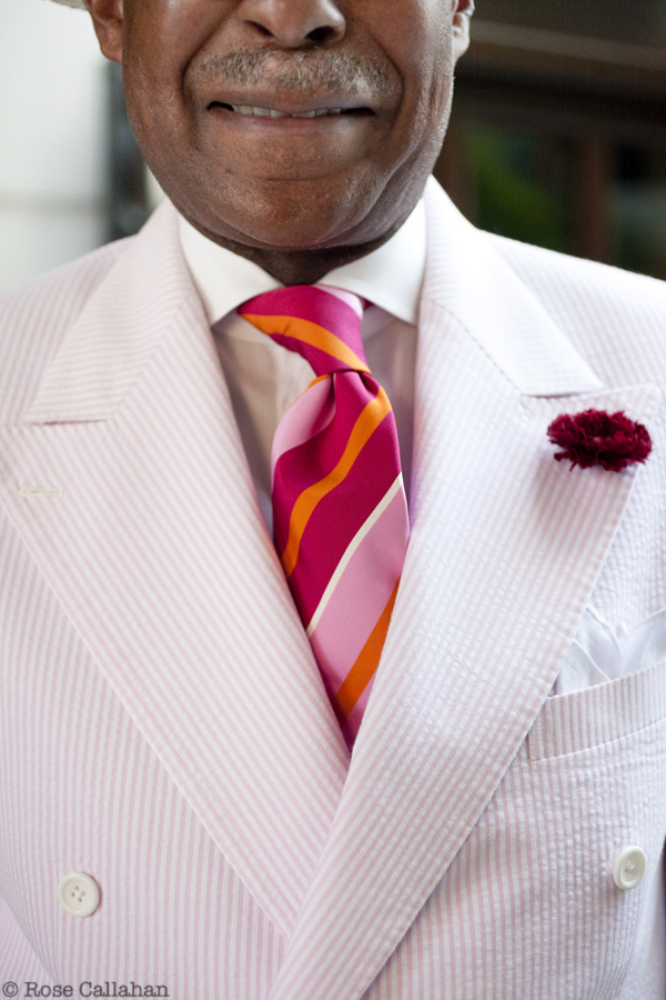 Here we see a pink seersucker suit. Slightly more casual fabrics like this can swing either way, so if Dr. Andre wanted, he could wear the jacket with something like tan chinos. Note how the fabric is more casual than grey flannel (and certainly slick worsteds worn for business)