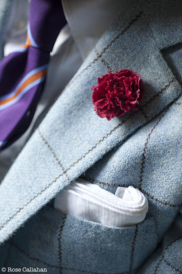 Since this is made from a slightly loosely woven tweed, we know it's a sport coat, not a suit jacket. Notice the combination of bold colors: baby blue jacket; purple tie; blonde tortoiseshell picking up orange stripe in tie; red carnation echoing hints of warmth in accessories.