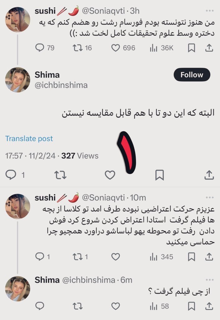 "Two eyewitnesses, who were present during the incident, shared details with BBC Persian that differ from accounts of an altercation with security. They said the girl ‘unexpectedly entered several classrooms holding a mobile phone, as if she was recording students.’ According to them, an instructor, upset by her unauthorized entry, sent a student to ask her intentions. However, one witness reported that upon encountering students, she ‘started screaming.’