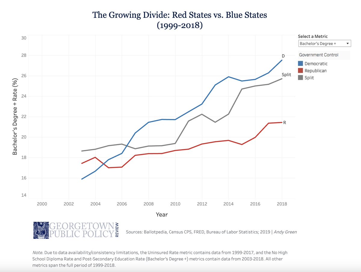 Em geral, estados com maior número de eleitores com ensino superior tendem a ser democratas e estados com menor número de eleitores com ensino superior tendem a ser republicanos.