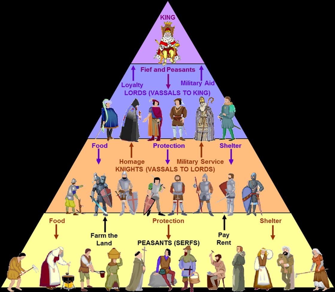 The system is best envisioned as a pyramid with a king (the ultimate “lord”) at the top, and a series of vassalages cascading down to the peasantry. Lower classes granted upper classes resources or military service, while upper classes granted lower classes protection and land.
