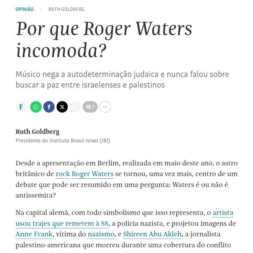 Em artigo publicano ano passado na Folha de São Paulo, a presidente da ONG Brasil-Israel disse que Roger Waters, o vocalista do Pink Floyd é antissemita e odeia judeus, em função de suas posições anti-Apartheid e anti-Genocídio.