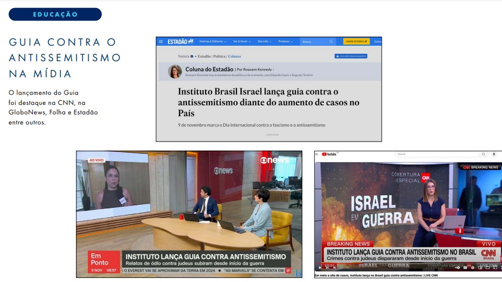 A ONG também exalta em suas redes os vários espaços que teve na grande imprensa, como nos veículos da Globo, Globonews, CNN, para difundir sua perspectiva de mundo sobre o conflito, que é de defesa de mais Sionismo na Palestina.