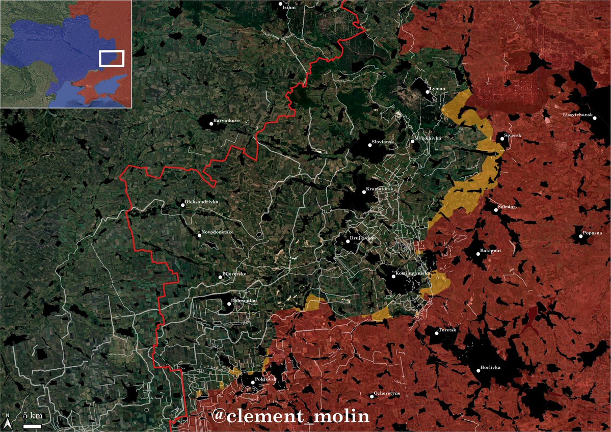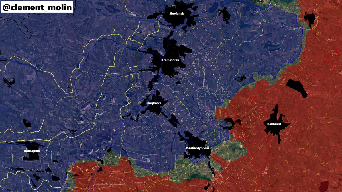 In the north, Siversk is still holding despite numerous assaults, then russian army still have difficulties to advance to Tchasiv Yar. The town of Klishchiivka, south of Bakhmout, is still holding.