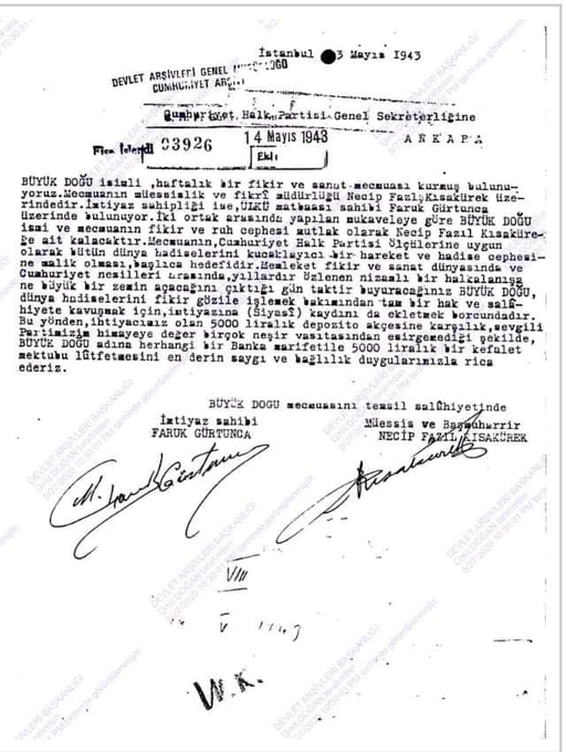 1943 yılının Mayıs ayında Necip Fazıl, Büyük Doğu isimli bir dergi kurduğunu ve CHP ölçülerine uygun yayın yapacağını söyleyerek CHP’den dergi için 5000 lira kefalet ücreti istedi.