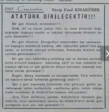 3⃣- Bu sürede Atatürk'ü öven yazılar yazdı. Büyük Doğu'nun onuncu sayısında "Atatürk dirilecektir" başlıklı bir yazı kaleme aldı.