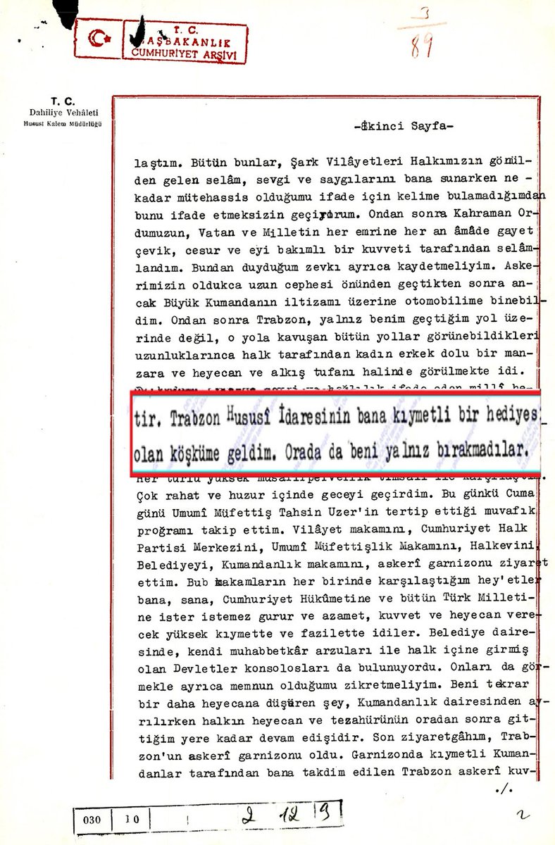 Atatürk’ün 1937 yılında gerçekleşen Trabzon ziyaretindeki faaliyetlerini anlatmak için 12 Haziran 1937’de İsmet İnönü’ye çektiği telgrafta kullandığı “Trabzon Hususi İdaresinin bana kıymetli bir hediyesi olan köşküme geldim.” ifadesi de söz konusu köşkün Atatürk’e hediye edildiğini göstermektedir.